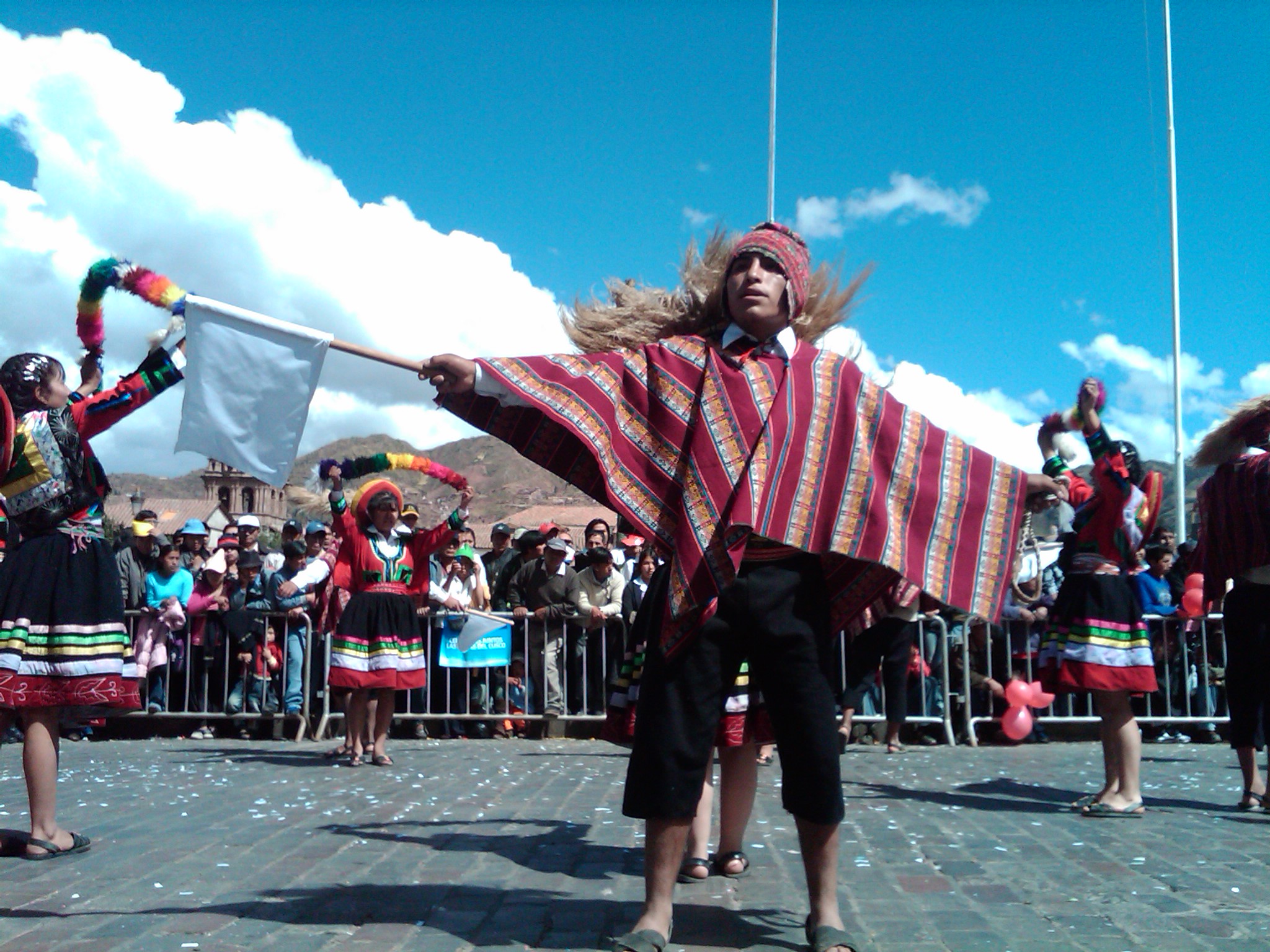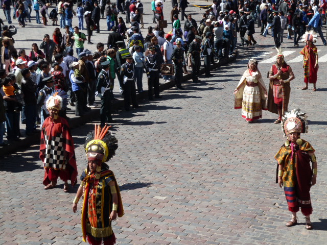 Fast forward two hours later. I’m sitting on the balcony of the Cappuccino Café in the Plaza de Armas. Suddenly there is drumming and Andean music blaring. A procession of men and women dressed in Inca vestiges enter the square. They are followed by a motorcade of police vehicles and trucks carrying boxes that hold – drum roll Jonatan – the returned Inca artifacts! More people enter the square.