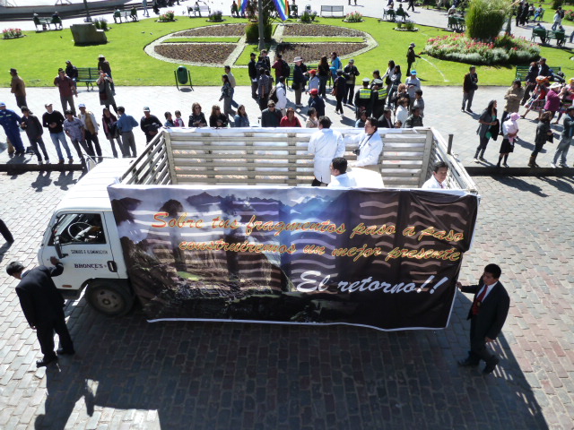 A proud people enter Plaza de Armas square, paying homage to their ancestors. They walk behind trucks carrying artifacts and bones of their Inca ancestors that were taken to the United States