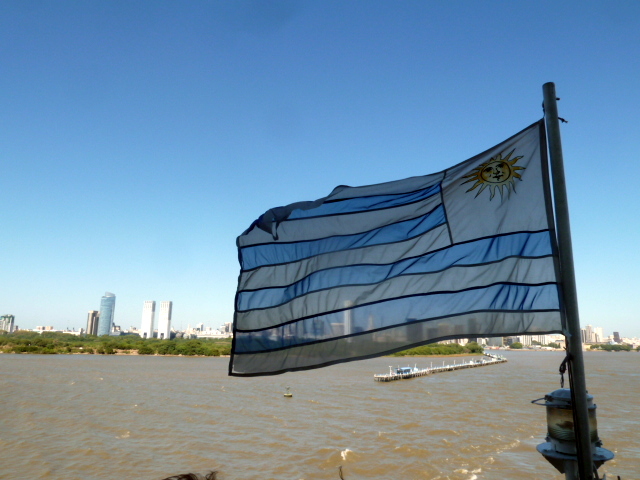 The BuqueBus: Ferry crossing the La Plata River, the world's widest river, from Buenos Aires (in the background) to Colonia, Uruguay. That's the Uruguayan flag fluttering in the wind.