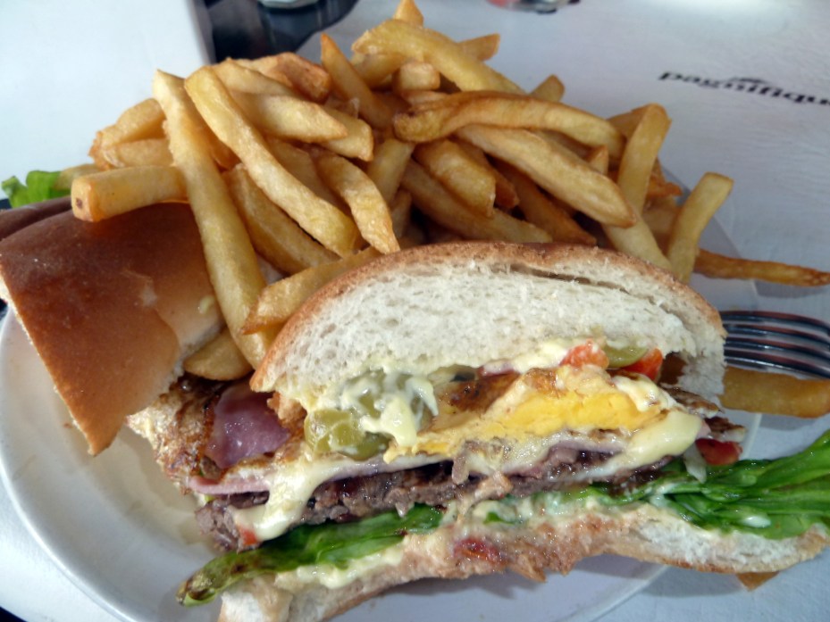 VEGANS LOOK AWAY!: Meat-eaters, you MUST have a chivito canadiense when you come to Montevideo: beef, ham, fried egg, lettuce, tomato, bacon, cheese, mayo, yum!